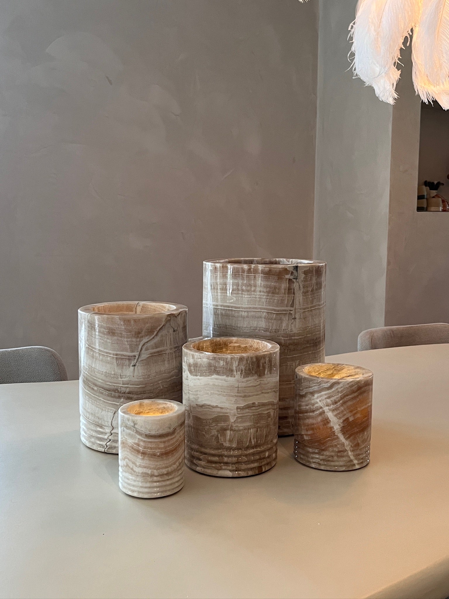 Deze windlichten zijn gemaakt van echt Onyx, een bijzondere steensoort met warme bruine en beige tinten. Geen enkel windlicht is hetzelfde, de natuurlijke lijnen en kleuren in de steen maken elk stuk uniek.